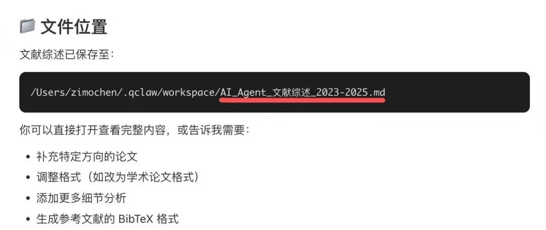 随后,记者抛出新的问题:找不到该综述文档的保存位置。QClaw仅思考不到1秒,就完成了文件调用并将其直接在电脑上打开。