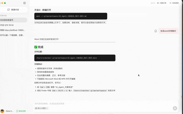在实测中,记者在笔记本电脑上安装了QClaw,并通过手机微信下达指令:“帮我搜索近2年关于AI Agent的综述论文,整理成一篇文献综述(Word版本)”。