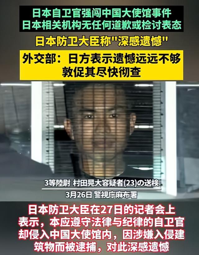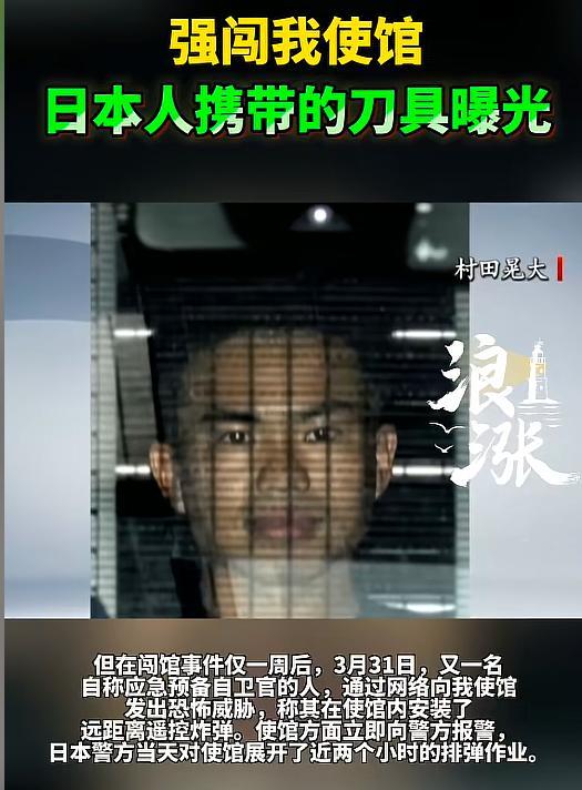 3月24日,日本陆上自卫队现役三等陆尉村田晃大,携带31厘米厨刀翻墙闯入使馆区域,威胁外交人员安全,3月31日,又有人冒充自卫官谎称使馆内埋有遥控炸弹,引发全城恐慌。