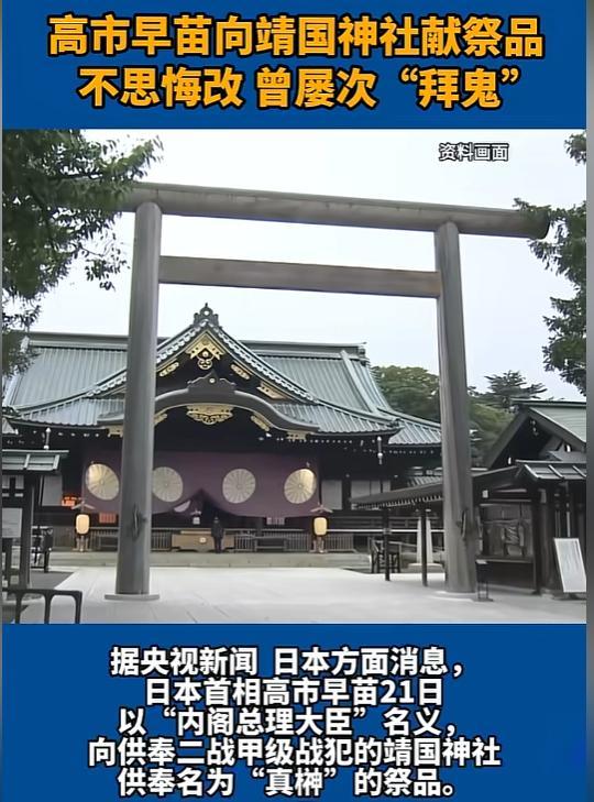 据日本媒体公开报道,4月21日日本首相高市早苗就以“内阁总理大臣”名义,向靖国神社供奉名为“真榊”的祭祀祭品。